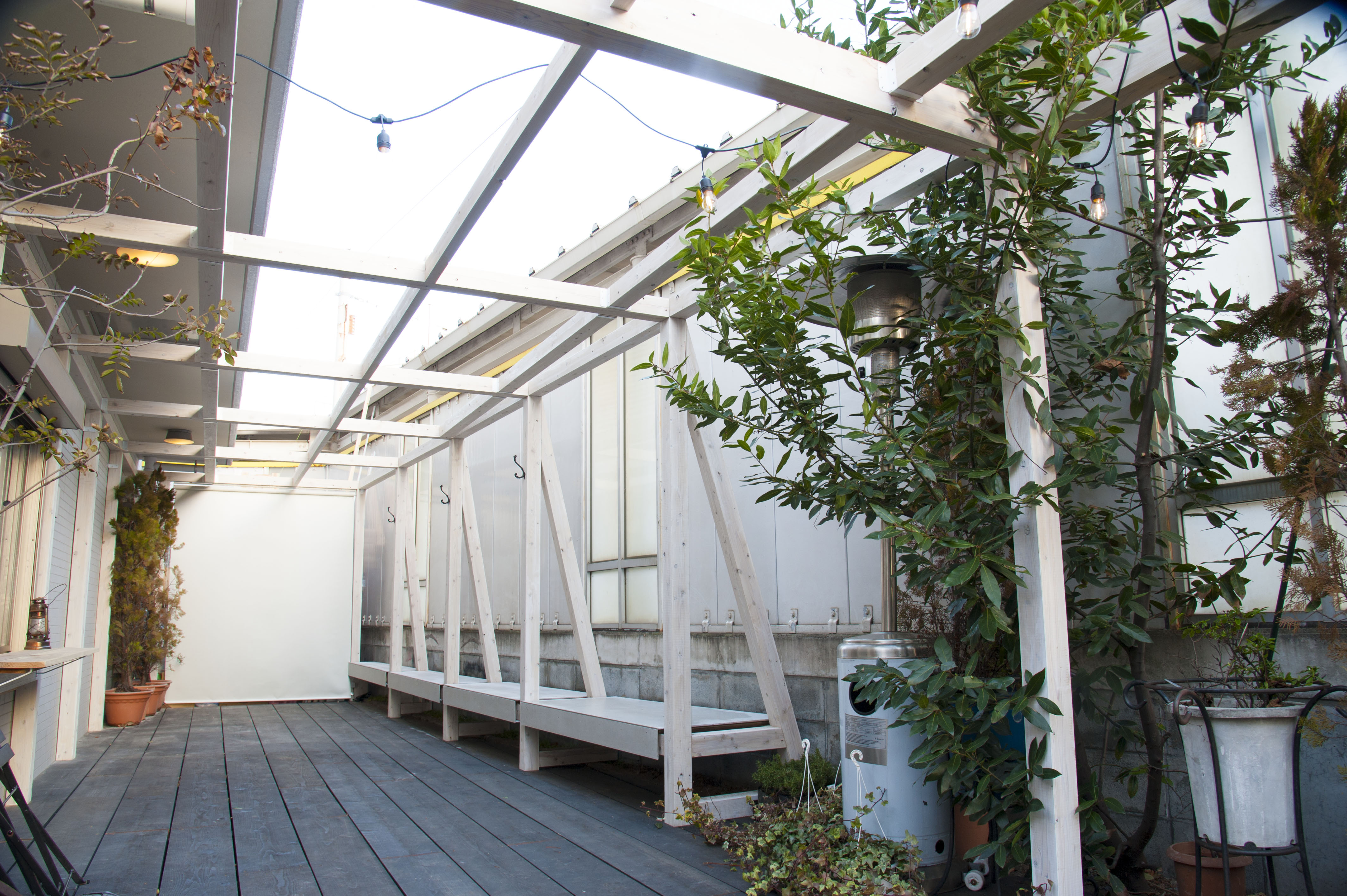 製材の際に不要となる杉枝も利用し、エントランスや展示空間に活け、整然と並ぶ杉の森の象徴として生き返らせます。屋外のテラスにもベンチである什器を設置して、まちへ開放し、展示に興味を持ってもらうきっかけの場としました。