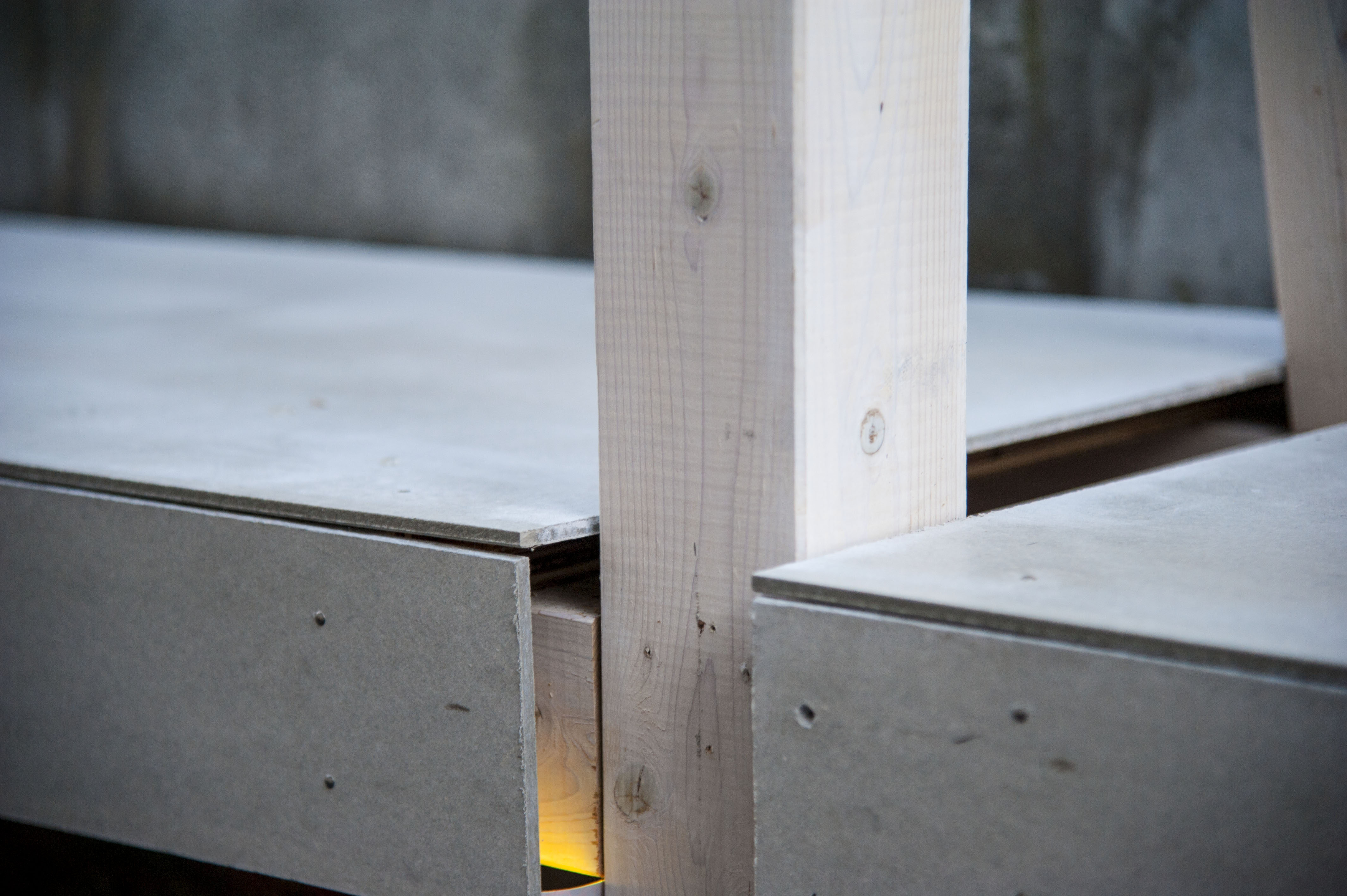 1つ1つの什器は、圧縮率の異なる木材やまだ製材されていない丸太等を積み重ねています。杉の森が家具になるまでの間に経てきた様々な工程や、材料が圧縮される様を視覚的に表現しています。